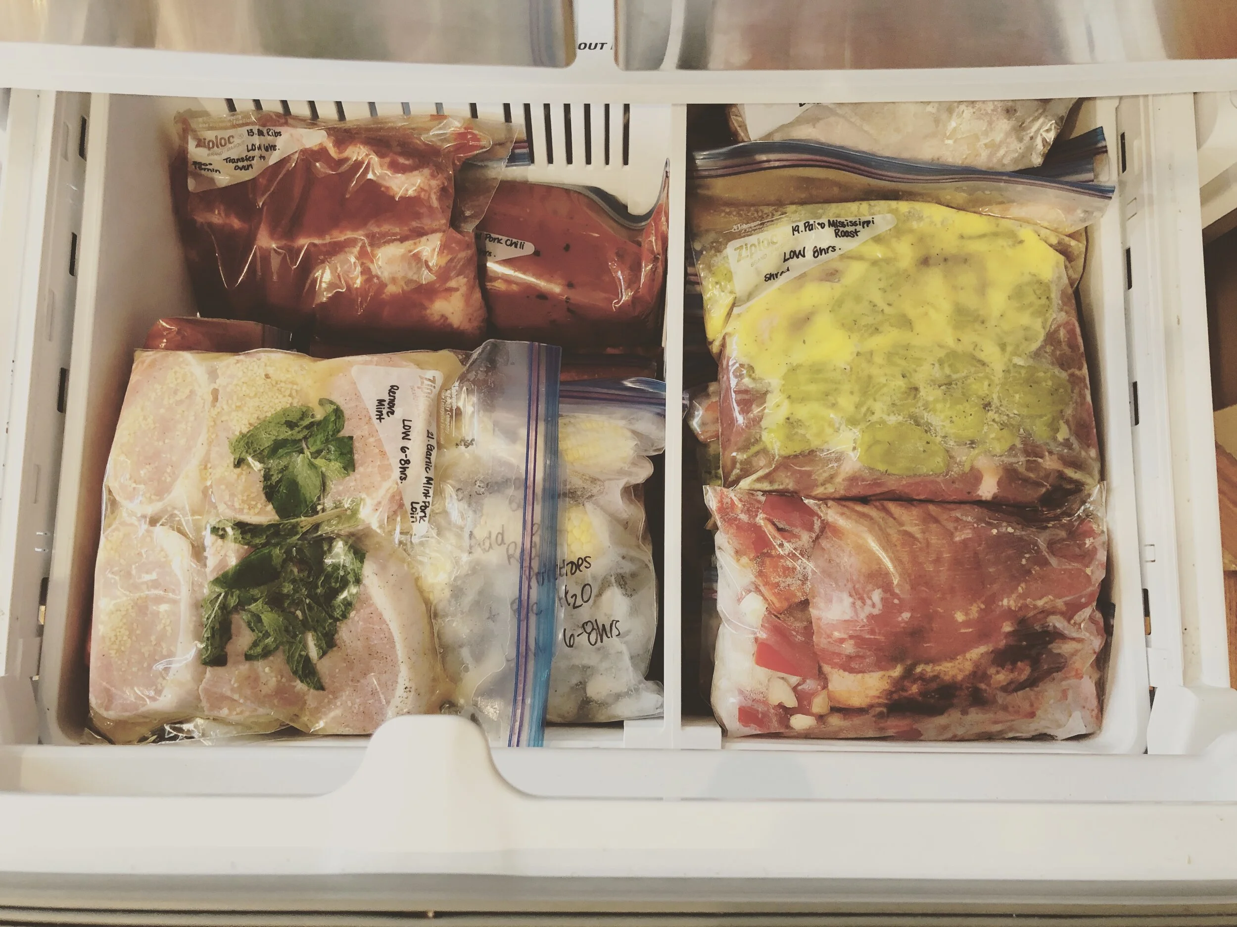 It's time to get those bags filled and in the freezer! I sometimes group the recipes by protein so I can keep my giant bag of chicken out instead of having all of my meat sit out and going between all of them. You'll find what works best for you after doing this a few times. Once you have a bag or two filled, you can start stacking them laying flat in your freezer. Once these are frozen, it's easier to store them like file folders and in numbered order for easy finding. You'll see that a few with roasts and larger pieces of meat won't go flat so these just fill in spaces behind and on top of the other ones. Remember to keep repeating every 5 bags or so, "you'll thank yourself later" and keep moving. You've got this!!